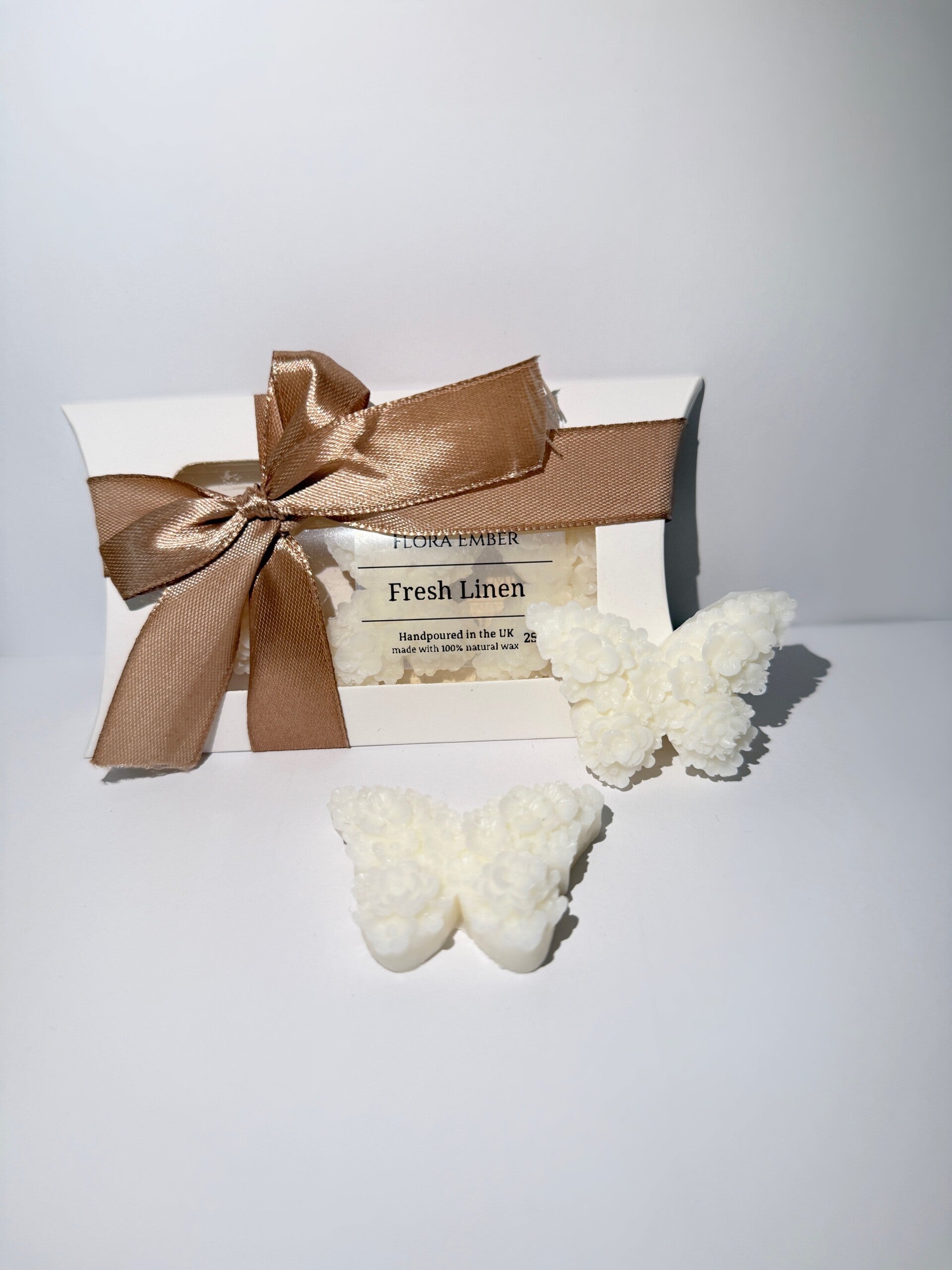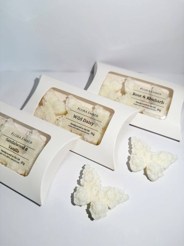This set showcases beautiful butterfly wax melts with floral details, elegantly shaped for an enchanting visual experience. Indulge in a touch of luxury and uplift the mood in your home with our long lasting fragrances - choose from our classic or premium collections.